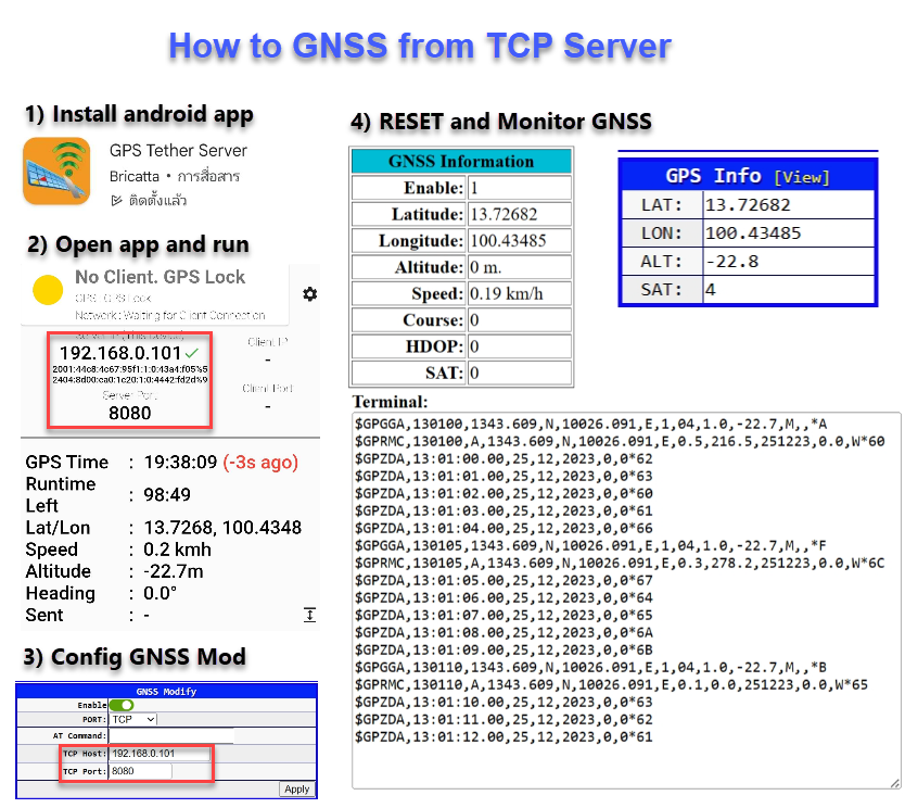 - Config GNSS on the ESP32IGate configuration MOD tab, Select PORT: TCP and by TCP Host IP same IP of app mobile phone.